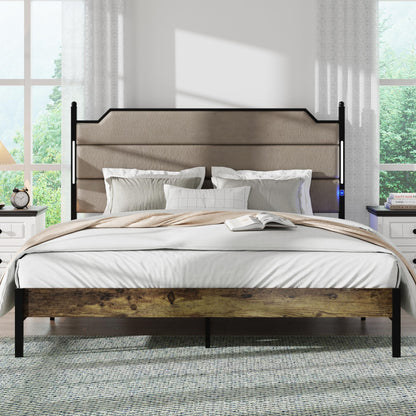 KELESY Bed Frame with Upholstered Headboard, Queen Bed Frame with Charging Station, Wood Slats, Easy Assembly,No Box Spring Needed,Industrial Brown